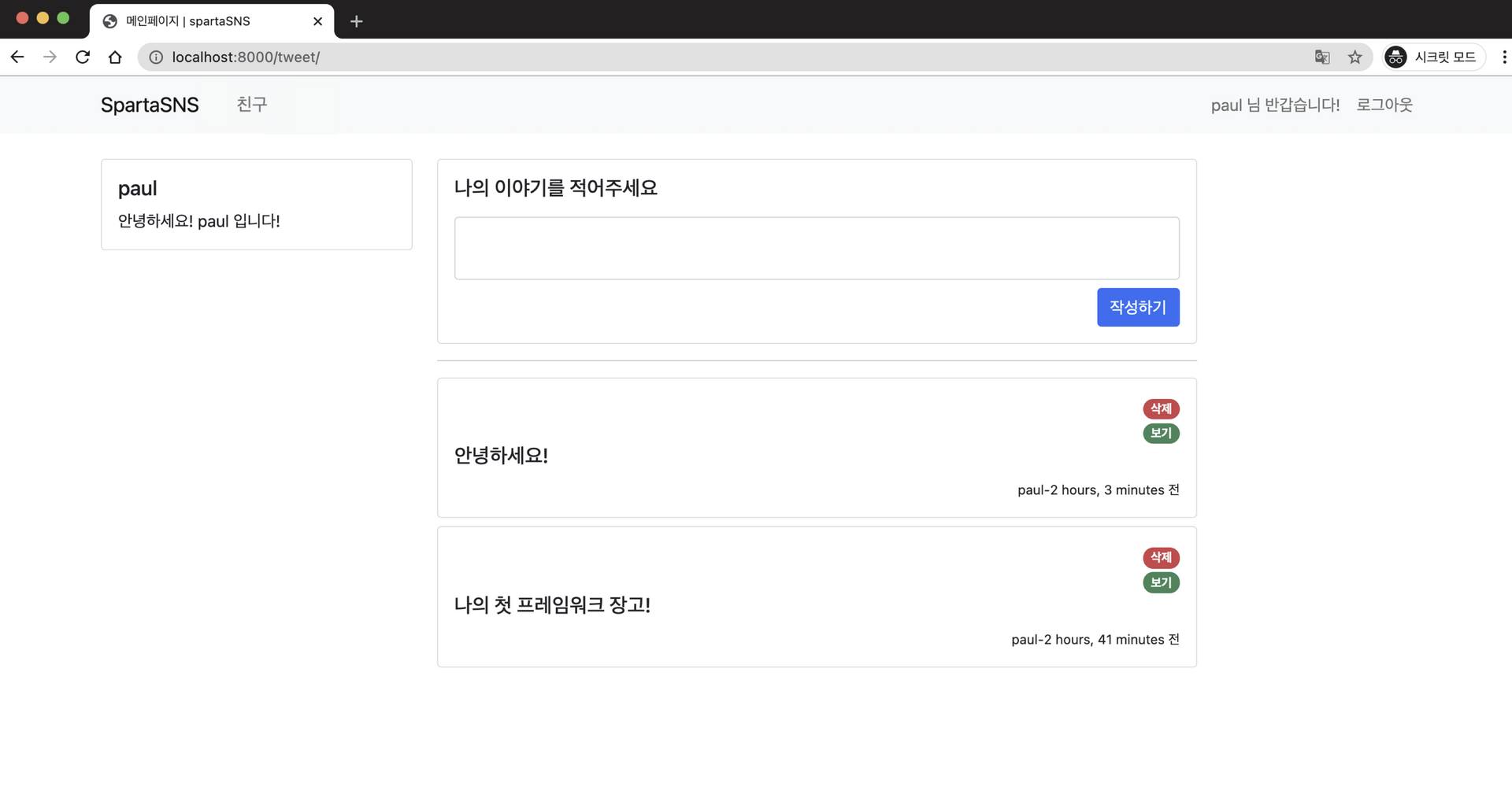2. 작성된 글 삭제하기 : 게시물의 고유한 id값을 기준으로 삭제(/tweet/delete/게시글의id)